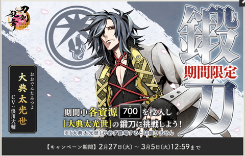 2024年07月30日 【終了】2024年8月 刀剣乱舞「鬼丸国綱」期間限定レシピ、髭切小烏丸も鍛刀確率上昇で一部の薙刀大太刀槍も出現する特別仕様【8/6まで】 カテゴリ:イベント2024年 コメント : 126