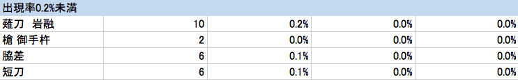 今回11.8%向上したのでその分打刀の出現率が59.1%に落ちています。太刀の出現率は1%低下しただけなのでそこまで大きく変わりありません。