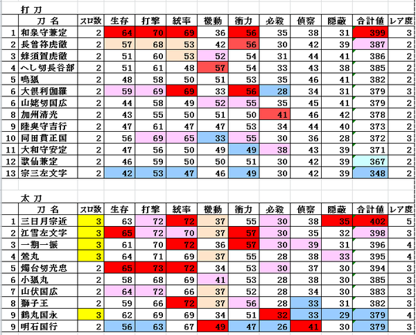 wiki参照したから間違ってたらあれだけど、刀装なしのステ値の打刀と太刀。兼さん強くなりすぎやろって必殺値が5もあがっただけなんだけど。 pic.twitter.com/HBh5XjaTjj