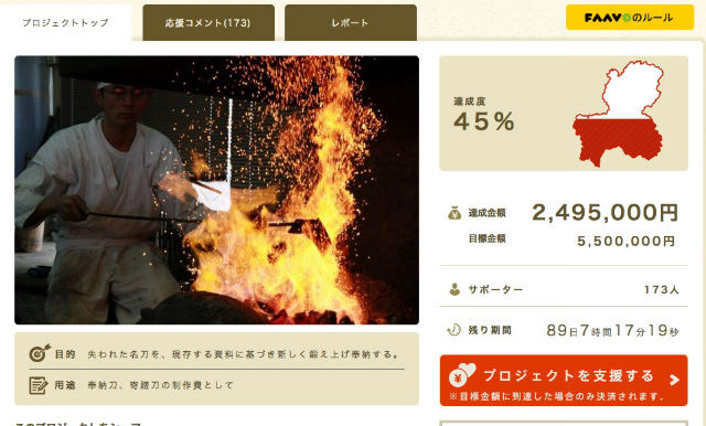 最大270万円を支援した人には蛍丸の写しの影打ちが収められると言う。