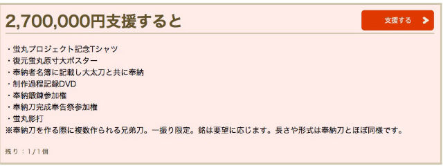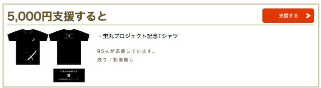 このプロジェクトへの支援は5000円から行うことが出来る。最大の支援可能額は270万円までだ。5000円支援すると「蛍丸プロジェクト記念Tシャツ」とやらが支援者のもとに届くようだ。
