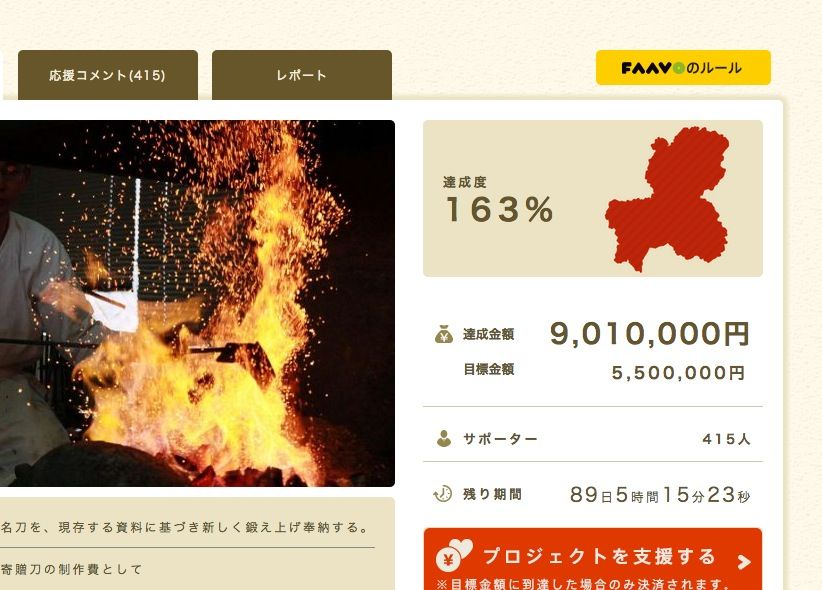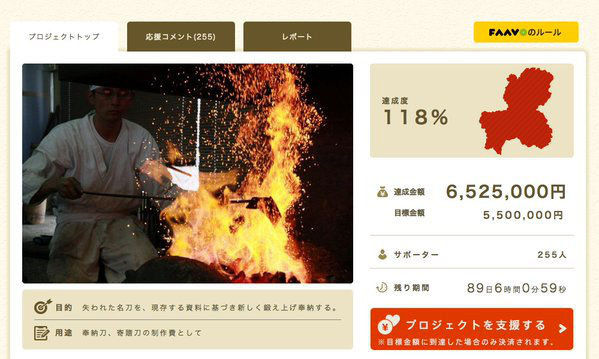 ネットで支援金を集うクラウドファンディングサービス「faavo」にて刀剣乱舞に登場している刀「蛍丸」の写しを作るプロジェクトが開催。現在そのための支援金550万円を集めるプロジェクトが行われている。※2015年11月1日16時30分時点で249万円集まる。