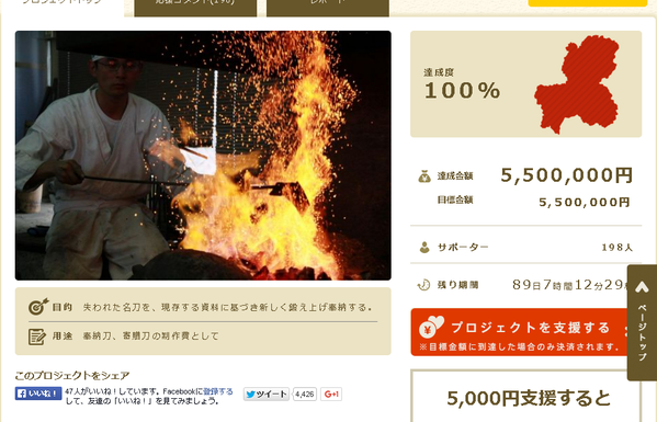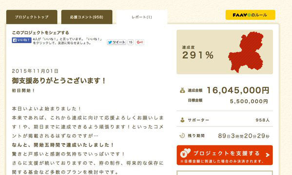 なんと僅か開始5時間ほどで目標達成額の550万円の支援金が集まる!