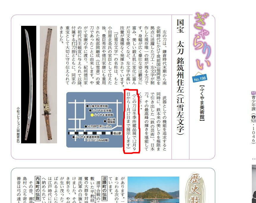 刀剣「江雪左文字」が ふくやま美術館に展示されるようです。