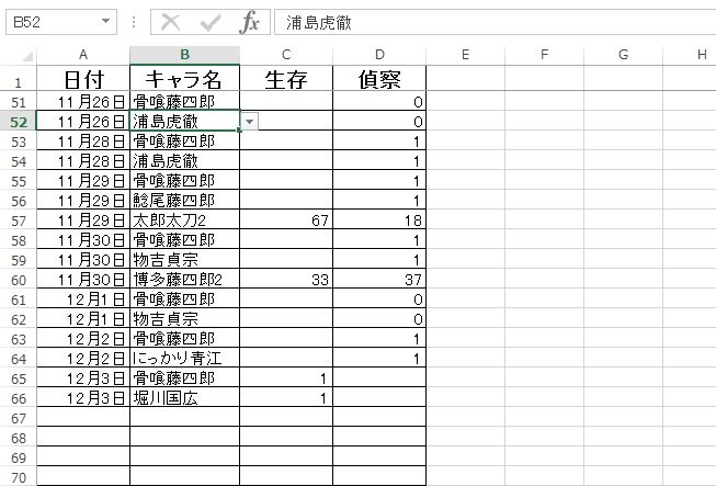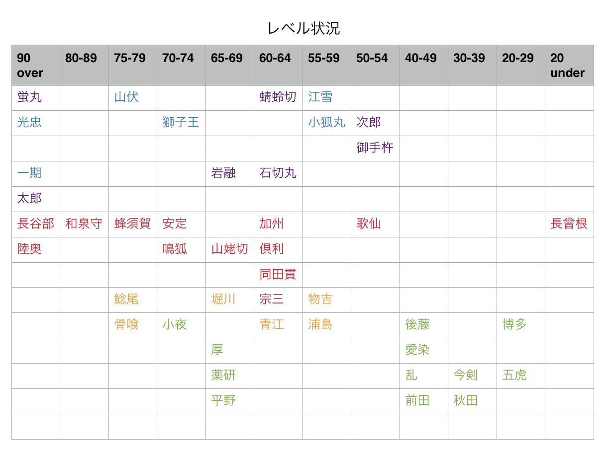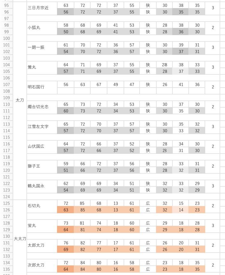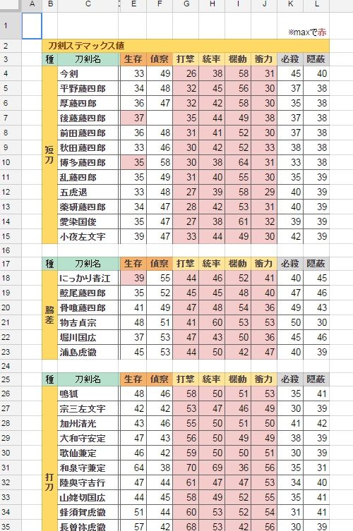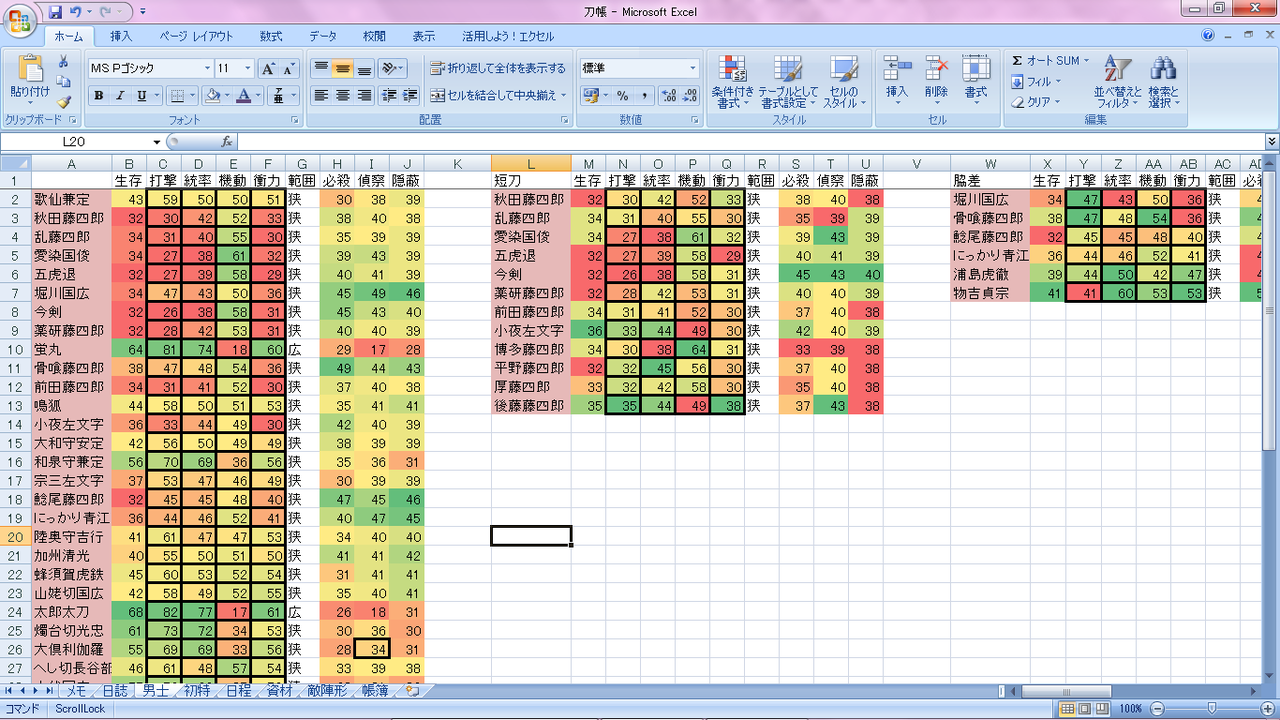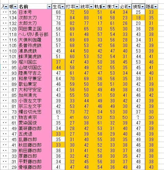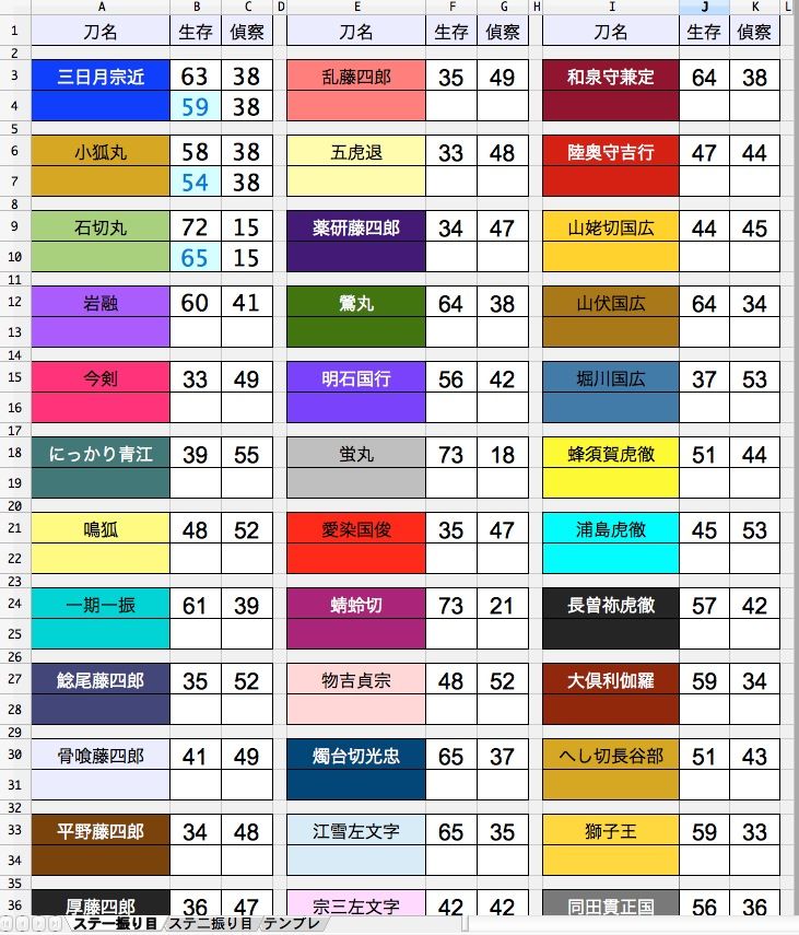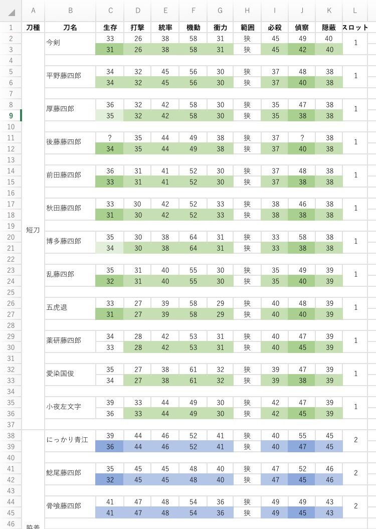 なんだ簡単じゃん、と2時間後には男士のステータス全部打ち込んだ表が出来てた。