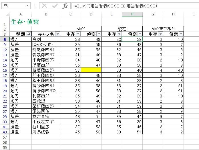 一応作ってるけどキャラと上限マックス値記入してあって、内番でMAXって表示が出たらそのセルを黄色にするだけというもっとシンプルなやつ