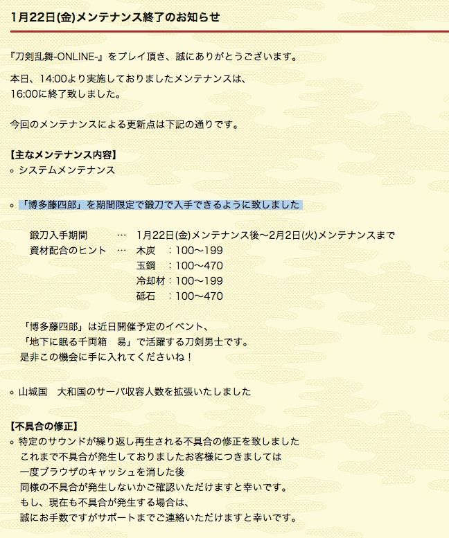 今回も博多藤四郎のレシピ情報は前回と同じようです。鍛刀入手期間 … 1月22日(金)メンテナンス後~2月2日(火)メンテナンスまで