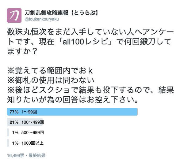 以下3つの簡易アンケートを行いました。数珠丸恒次をall100で入手した人はどんな鍛刀を行ったのかが気になりました。twitterに投げた質問は以下3つ。