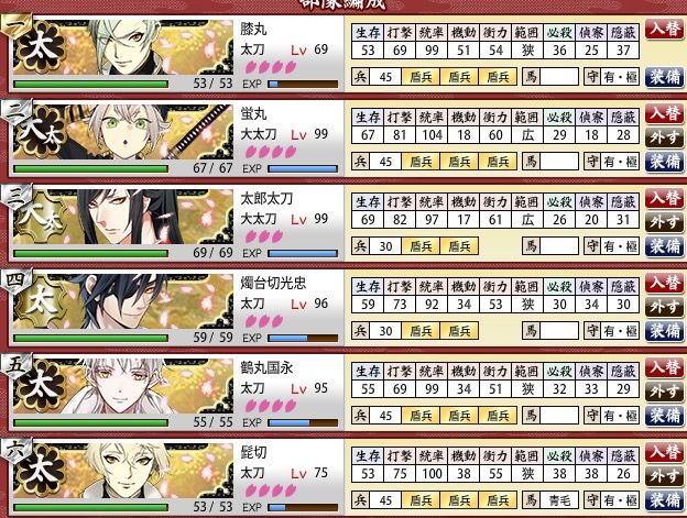 経験値乞食したかったんでカンストは蛍丸だけで、他は84~の膝髭、90超えの三日月鶯日本号に軽騎軽歩でもA勝利安定してたよ。