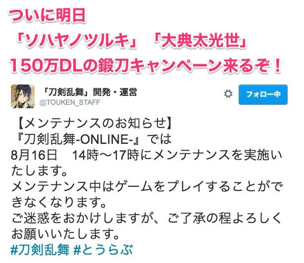 — 「刀剣乱舞」開発・運営 (@TOUKEN_STAFF) 2016年8月15日