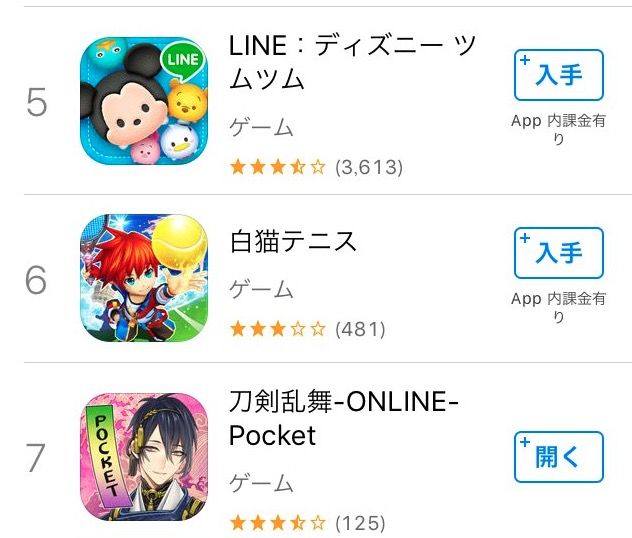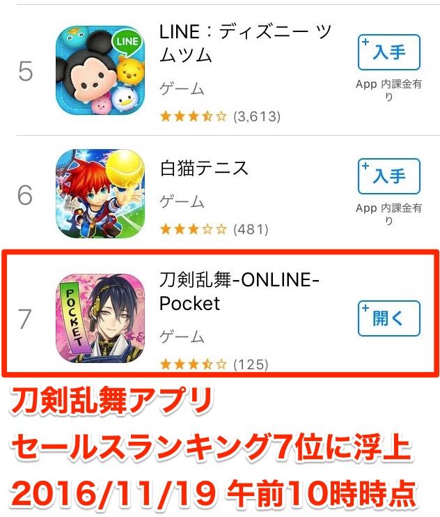 刀剣乱舞-ONLINE-(とうらぶ)のアプリ、刀剣乱舞-ONLINE-Pocketがappstoreのセールスランキング7位に浮上。