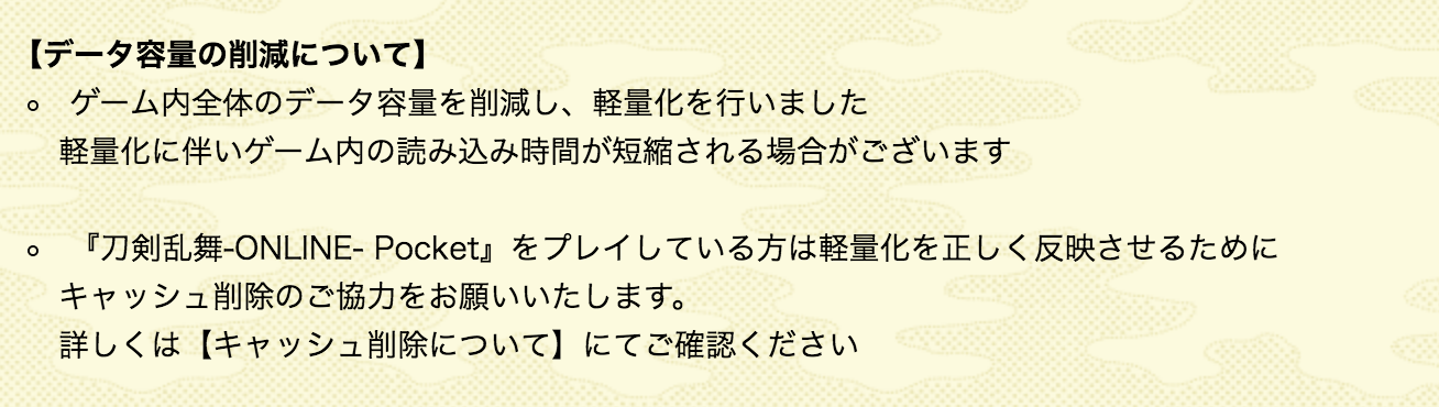 今回のメンテナンスでゲーム内全体が軽量化されたみたいです。「刀剣乱舞-ONLINE-Pocket」をプレイしている方は軽量化を正しく反映させるためにキャッシュ削除のご協力をお願いしますとのお知らせがされています。