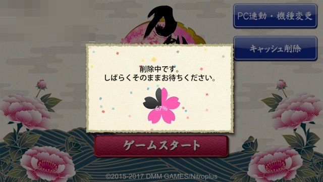 キャッシュ削除完了後、自動的にアプリが再起動されます※ ユーザーデータや所持刀剣男士や所持アイテム、その他これまでのゲームプレイデータに影響はございません。※ キャッシュ削除を行うとデータの再ダウンロードが実行されます。お客様の通信環境によっては、お時間を頂戴する場合がございますので、あらかじめご了承ください。通信環境の良い場所にて実行くださいますよう、お願いいたします。