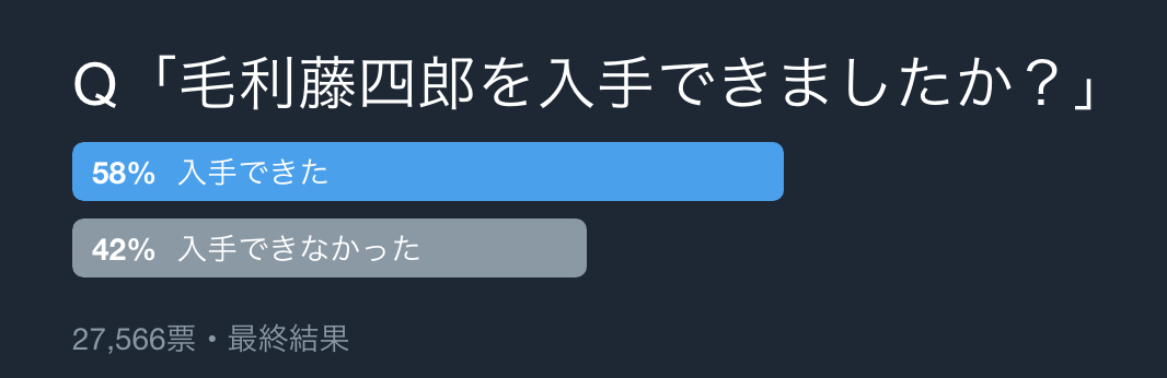 大阪城が終了しました。いつものイベ終了後のアンケートをとって見た結果、毛利の入手率は2万7566標中「58%」でした。