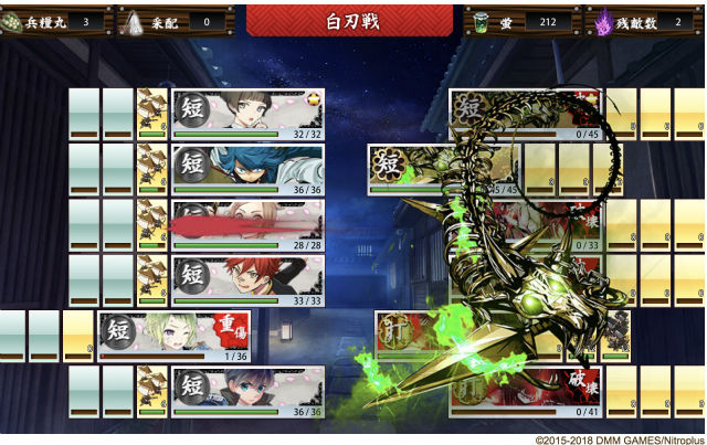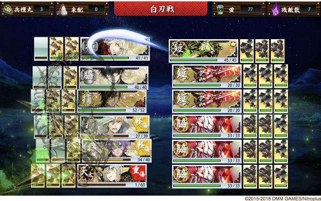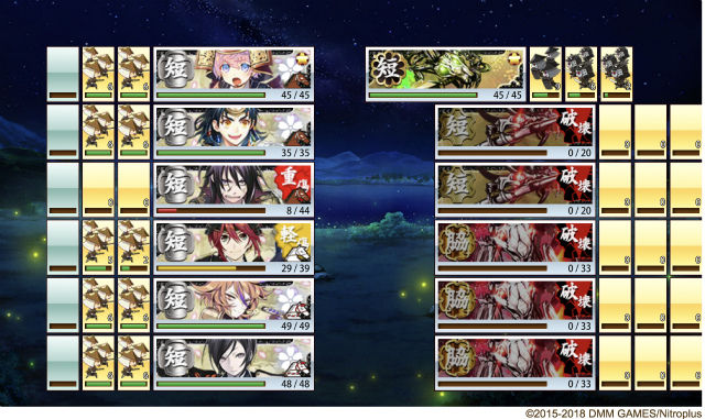 ※蛍丸がいる部隊で敵を倒すと取得量1.5倍 - 陣形の選択フェーズは無し(しかし戦闘に入ると何かしら陣形の補正がかかっているとの噂)