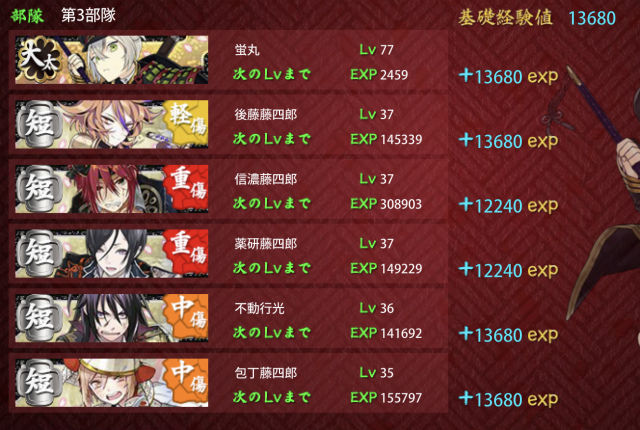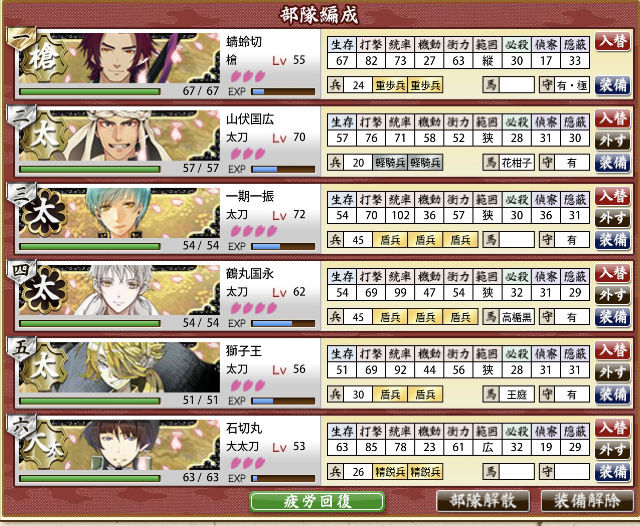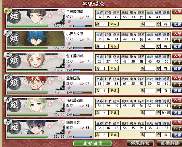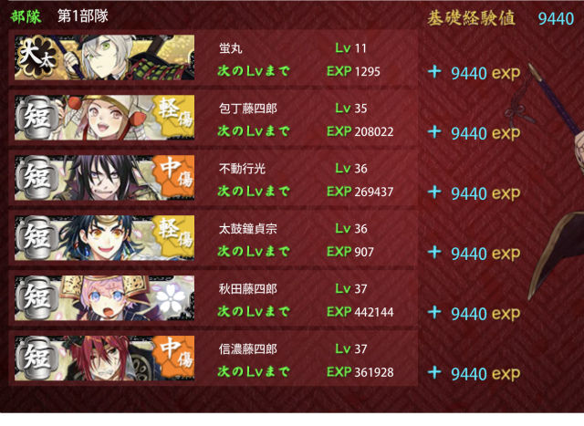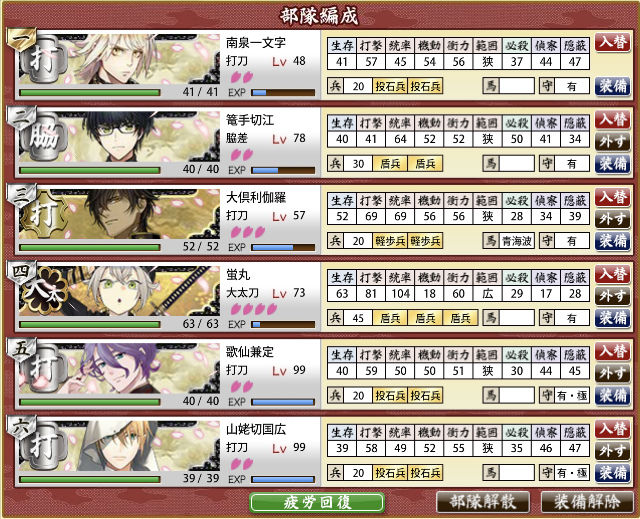 レベル81部隊(太刀2打刀3脇差1)でも、兵糧丸一個あればクリアできるんだね