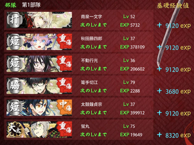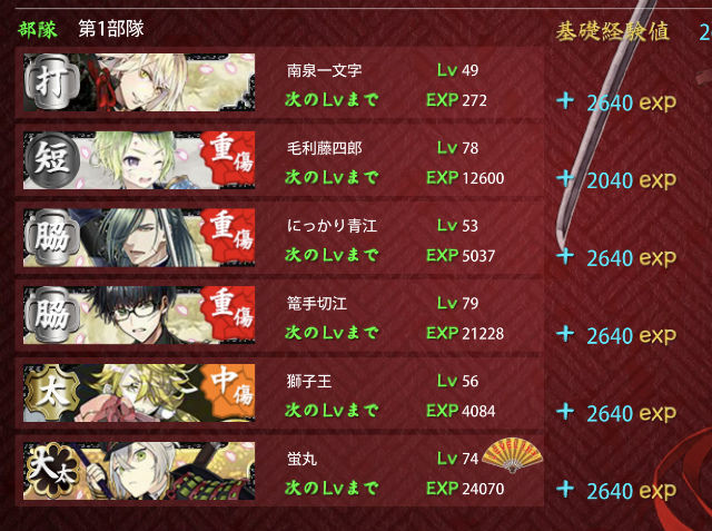 あとは極骨喰lv61→72 極青江lv61→70、付き添いの極短刀4人(2人ずつローテで投入)lv74→81