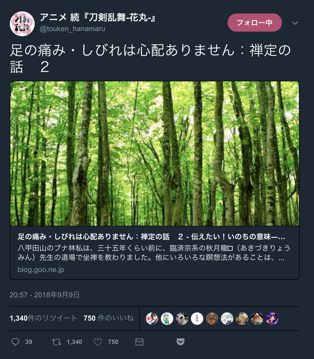 アニメ刀剣乱舞花丸の公式twitterさんが謎のミスをする刀剣乱舞コンテンツとは全く無関係の禅定系のブログの記事をツイート