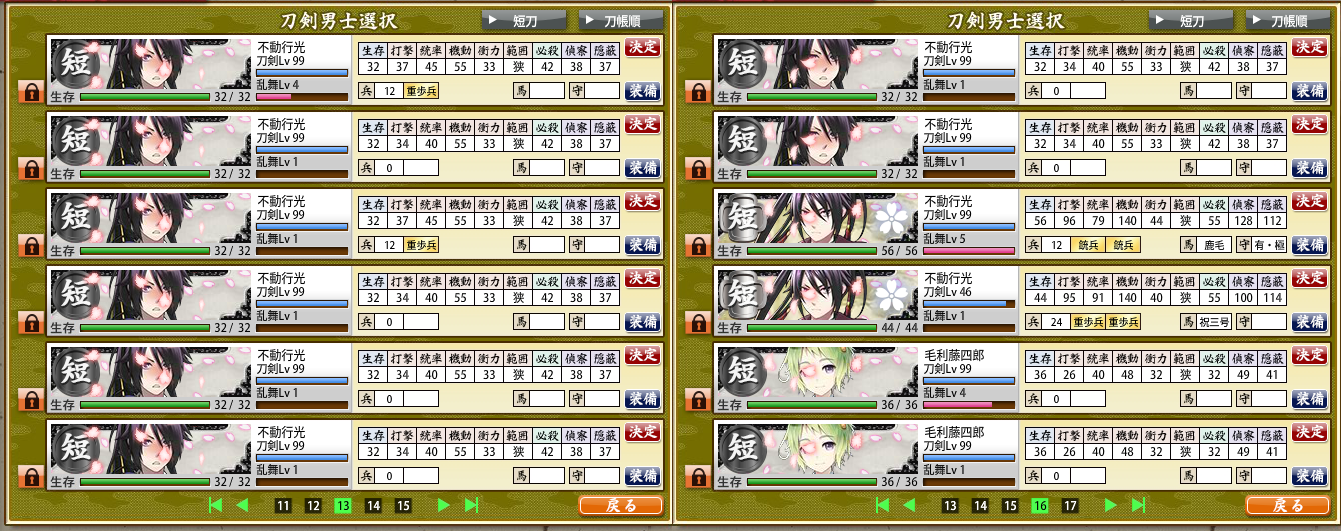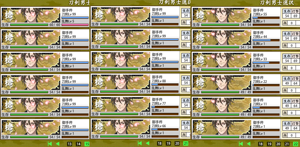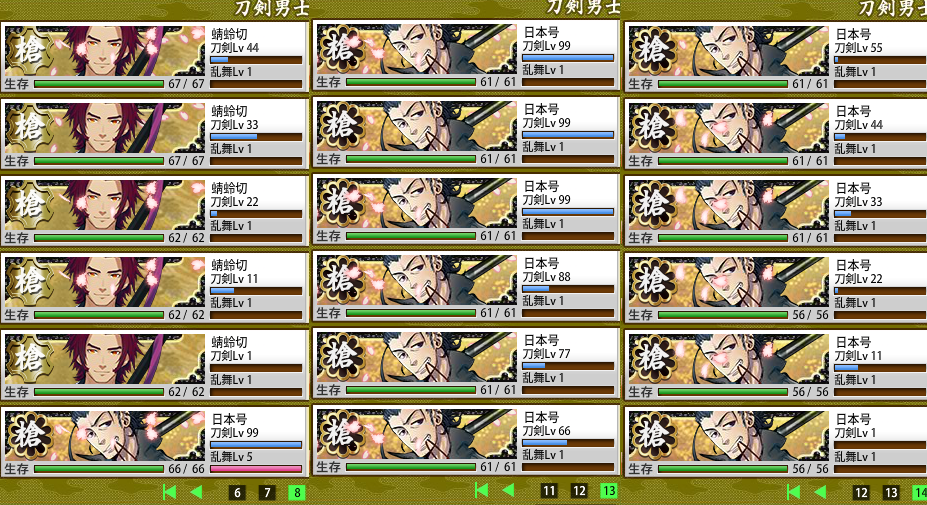 階段レベル… 刀剣男士を集めてそれぞれのレベルを「1、11、22、33… 〜99」と言う様に、一定の規則性を持ってレベル99まで揃える行為のことを言う。なお刻み方は様々、レベル「1、2、3 〜99」と言う様に1刻み毎に階段レベリングする猛者もいる。