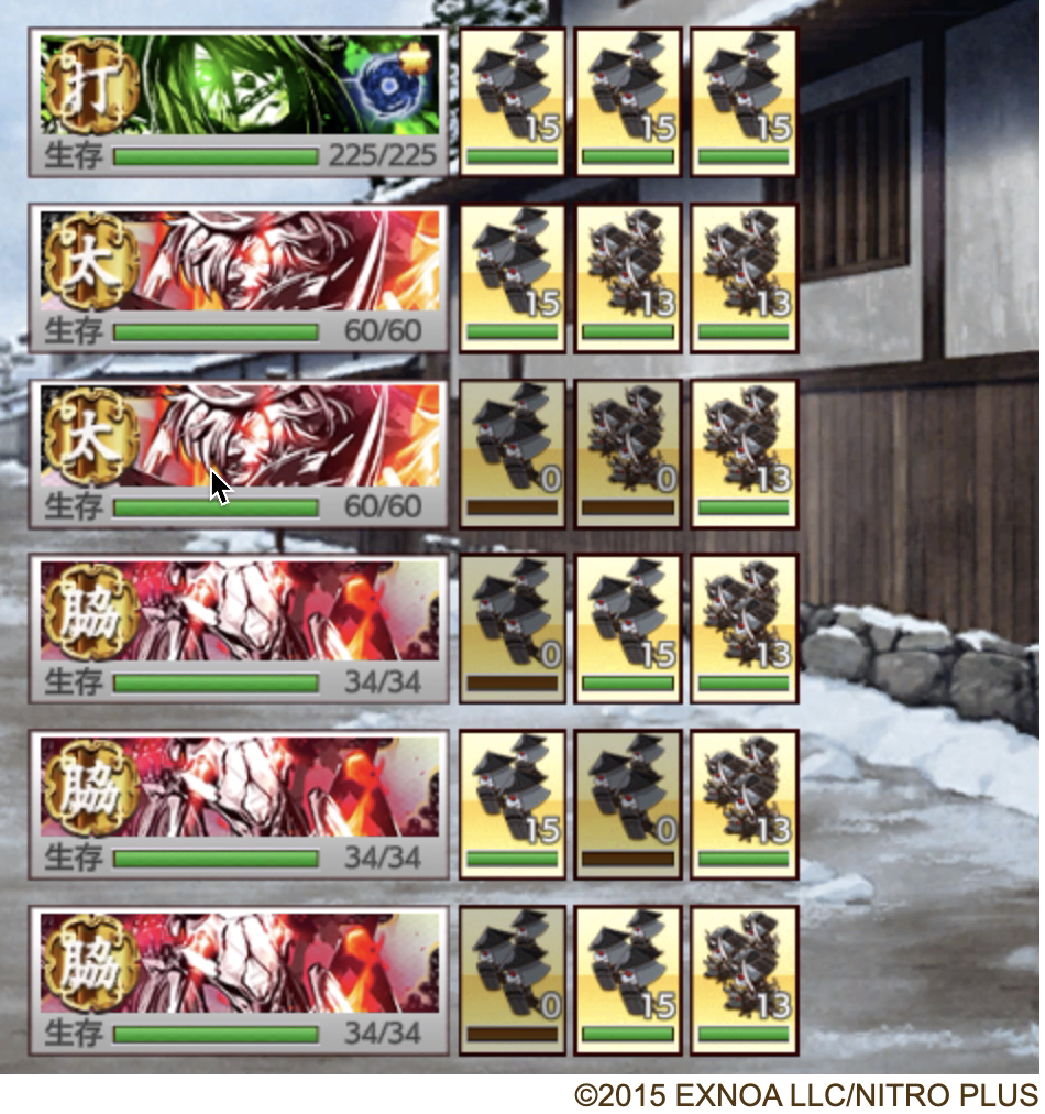 - 極短刀Lv40未満6振り+銃兵の場合は敗北リスクあり、敵を全て倒しきれず5〜8戦目で1〜2振り重傷になり9戦目で敗北ってパターンが多いので交代用の控え部隊は必須