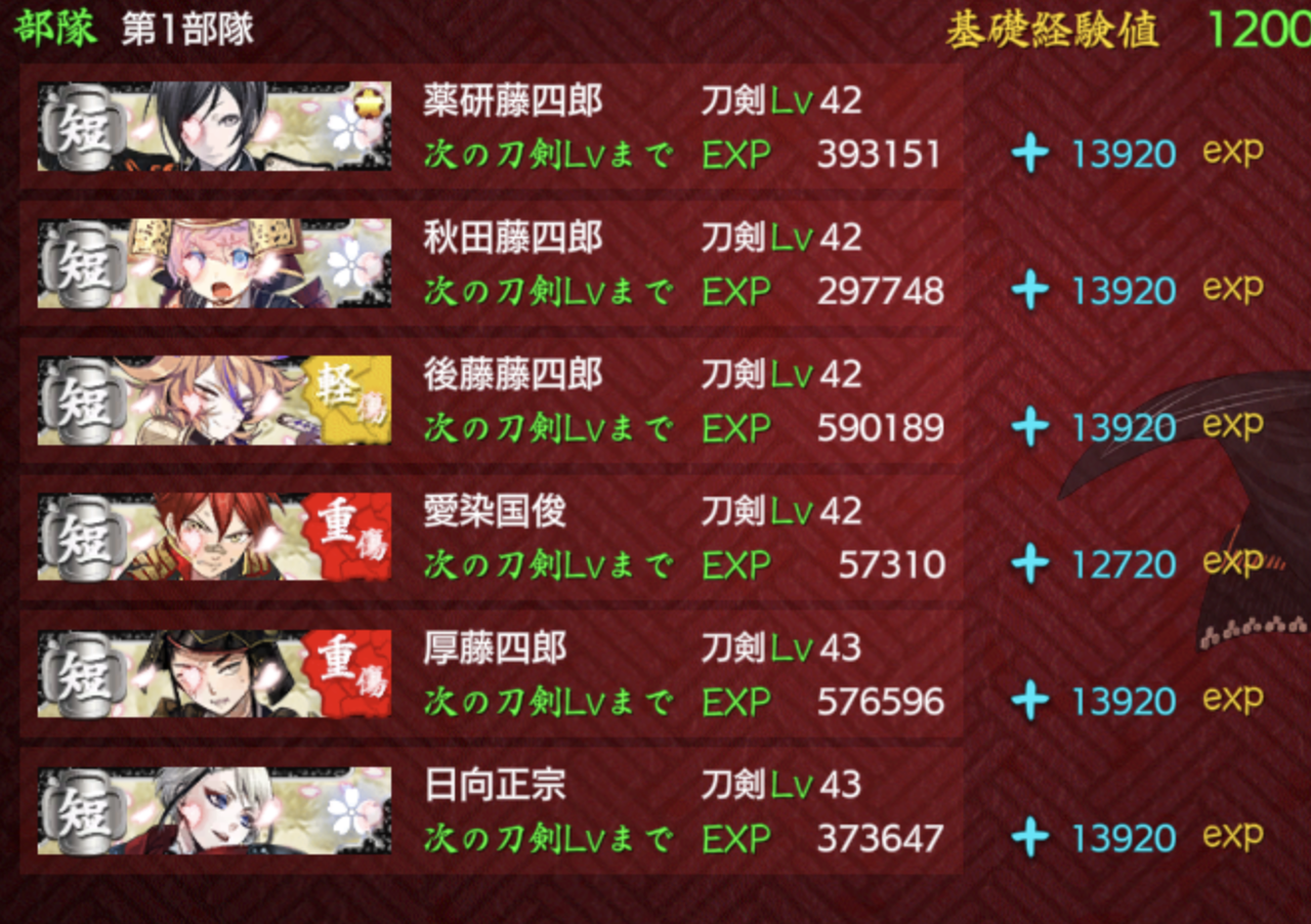 4戦目夜戦の隊長が、極短刀でも刀装削るまでしかいけない…堅い…。