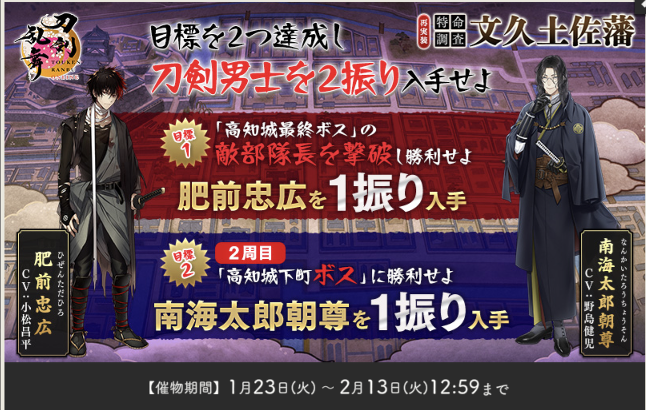 | イベントの目的 | 新刀剣男士「肥前忠広」と「南海太郎朝尊」の入手 |