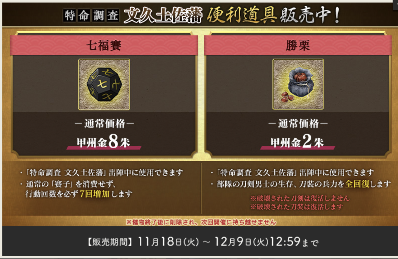 | 回想回収条件 | 2周目の高知城下町ボスに勝利で全て解放される条件は整う ただし、陸奥守と陸奥守極がいないと関連の回想は解放されない 陸奥守を入手すれば解放される(イベント終了後でもOK) イベントを最大限楽しむためには陸奥守吉行を連れて行くと良い |