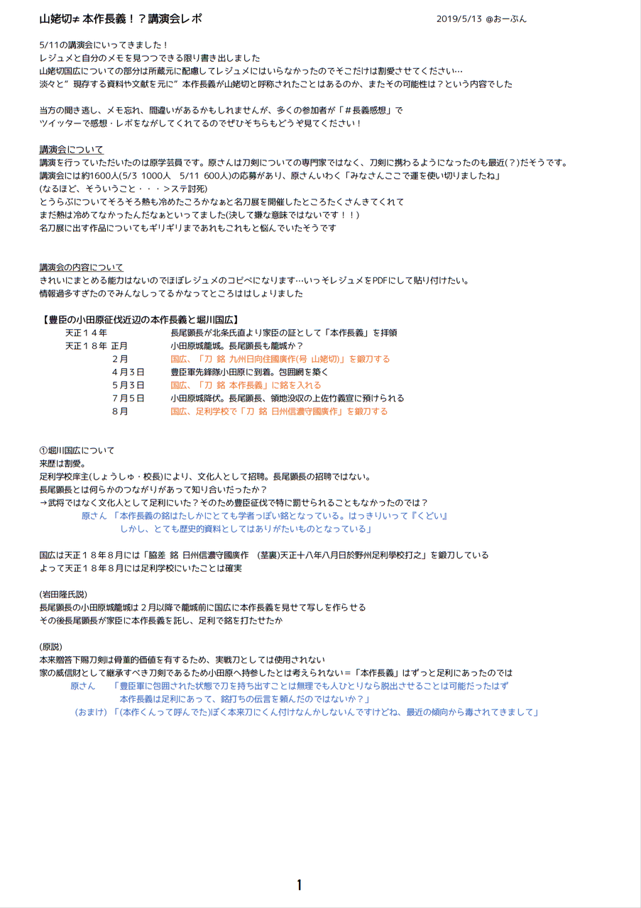 5/11のほうの本作長義の講演会いってきましたレポつくりました!