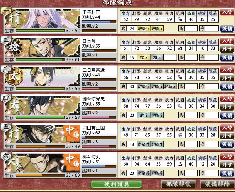 これくらいレベルがあれば刀装を大量に溶かさずに行けるはず(ボス戦はしない)