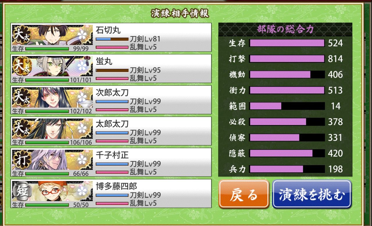 カンスト極短刀部隊なら自軍がカンストしてなくても陣形ガチャで勝てたりするけど 正直自分は1番当たりたくないのはカンスト極脇差部隊だーね
