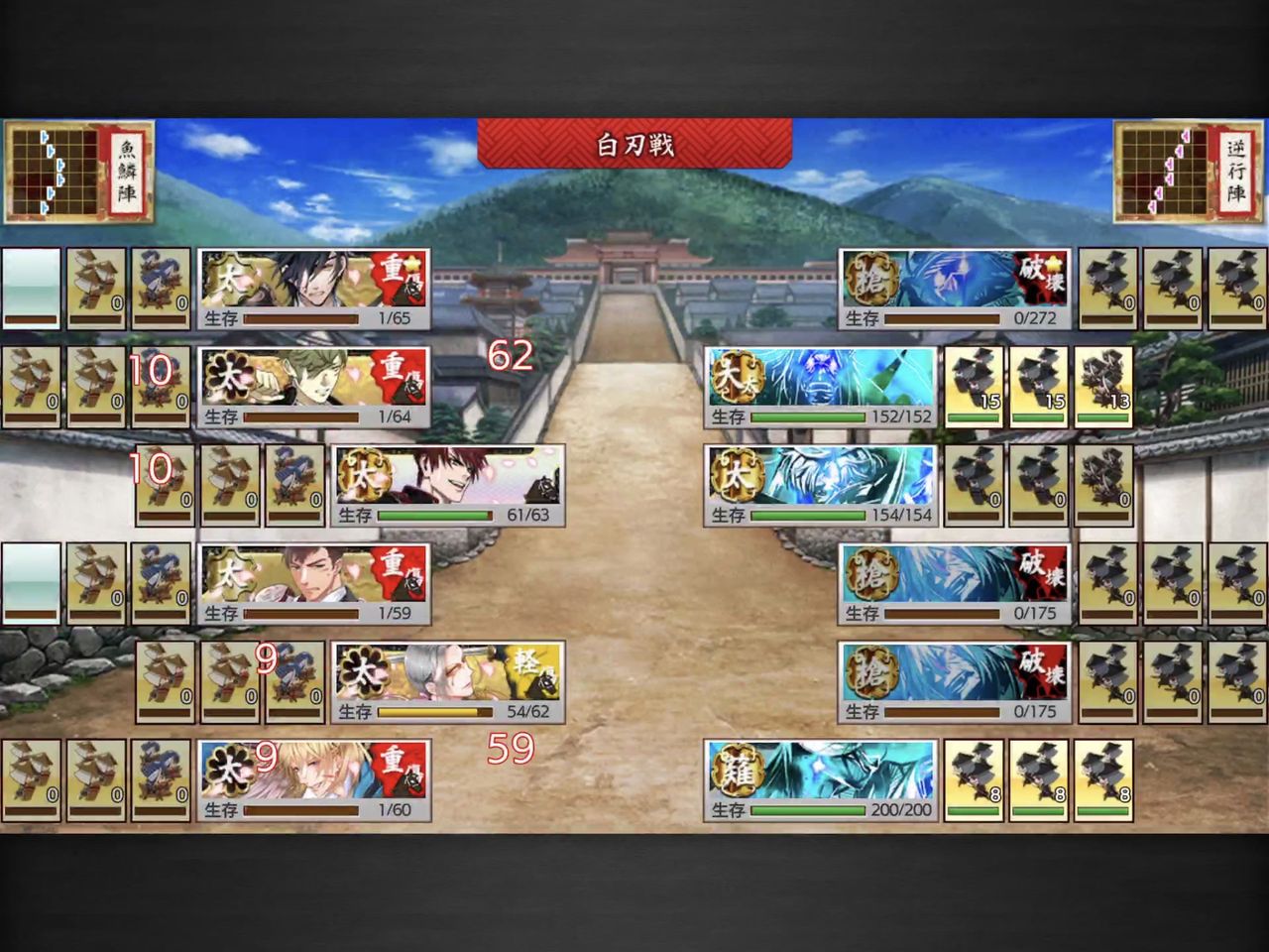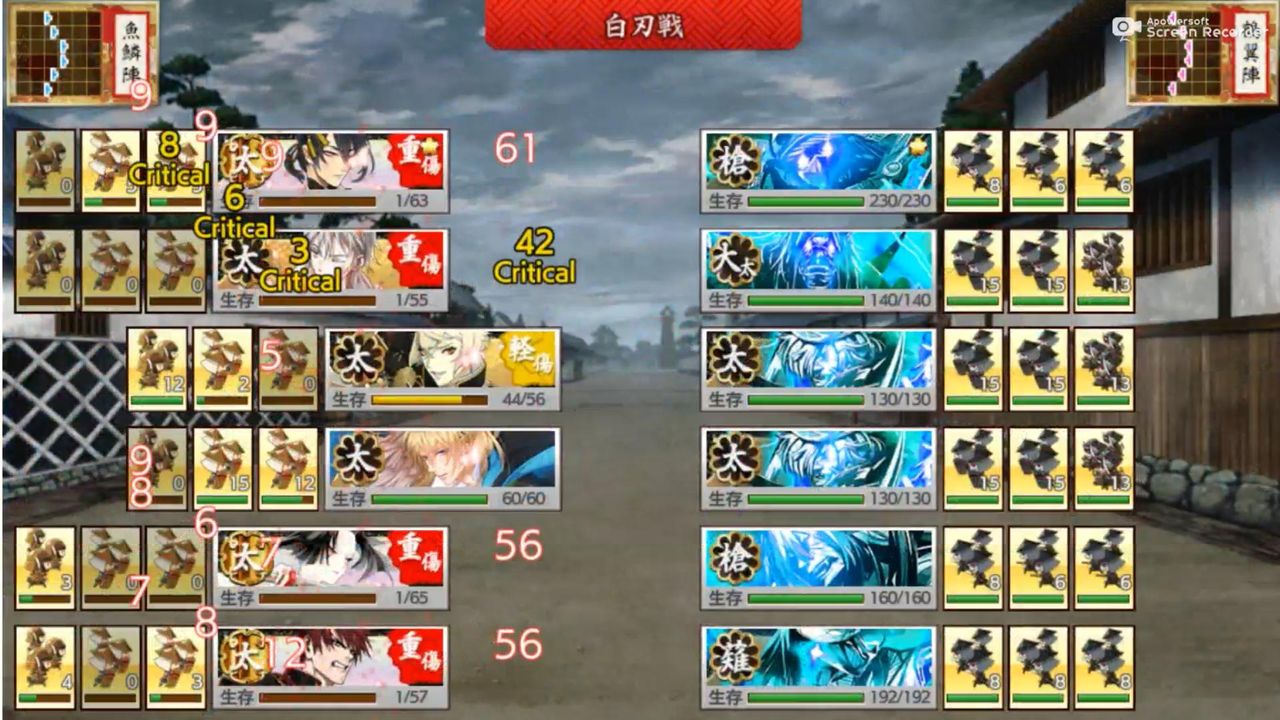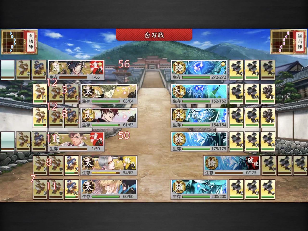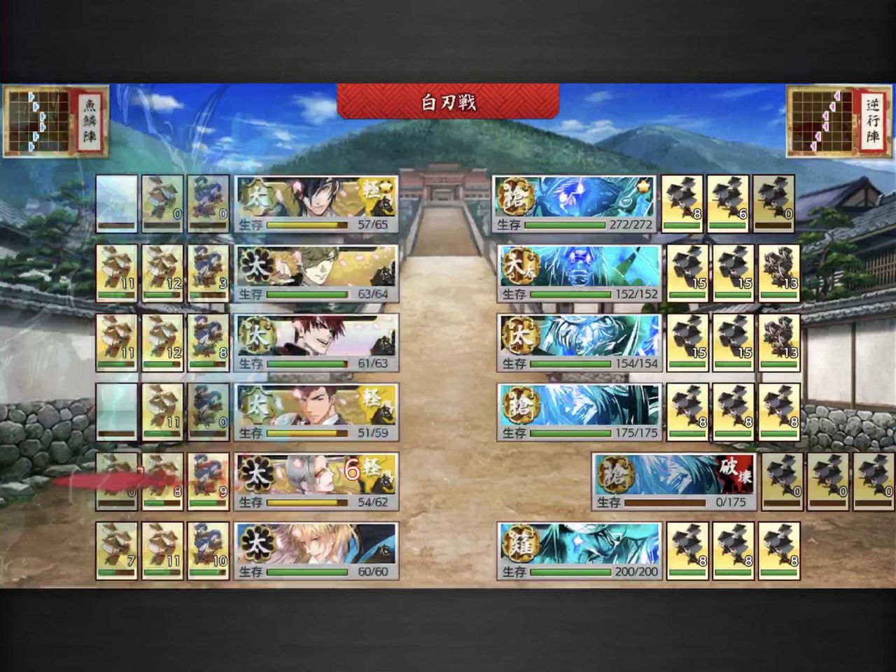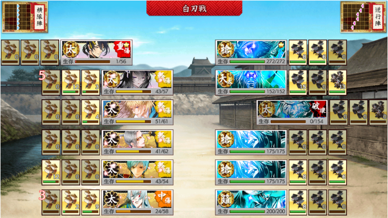 通常敵は短刀、脇差まではワンパン可能。クリティカルだと大太刀も倒せましたが、他は残りました。