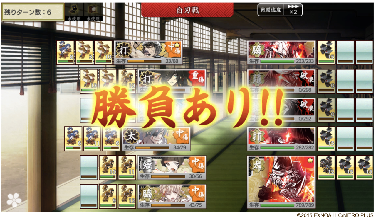 刀剣乱舞-ONLINE-ゲーム画面より引用▼ただし押し出し勝利になりがちなので敵撃破数は稼ぎづらいです刀剣乱舞-ONLINE-ゲーム画面より引用