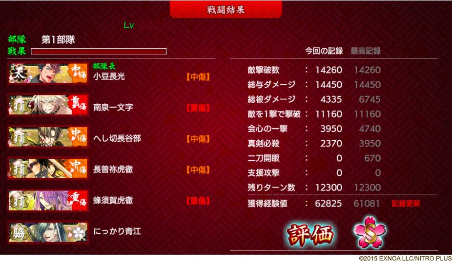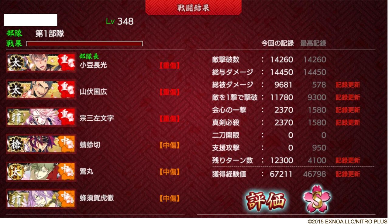 中傷状態で出陣する真剣必殺狙い編成は今回も有効、低レベルの極で特級でS評価取るなら有効。ただし押し出し勝利になりがち。