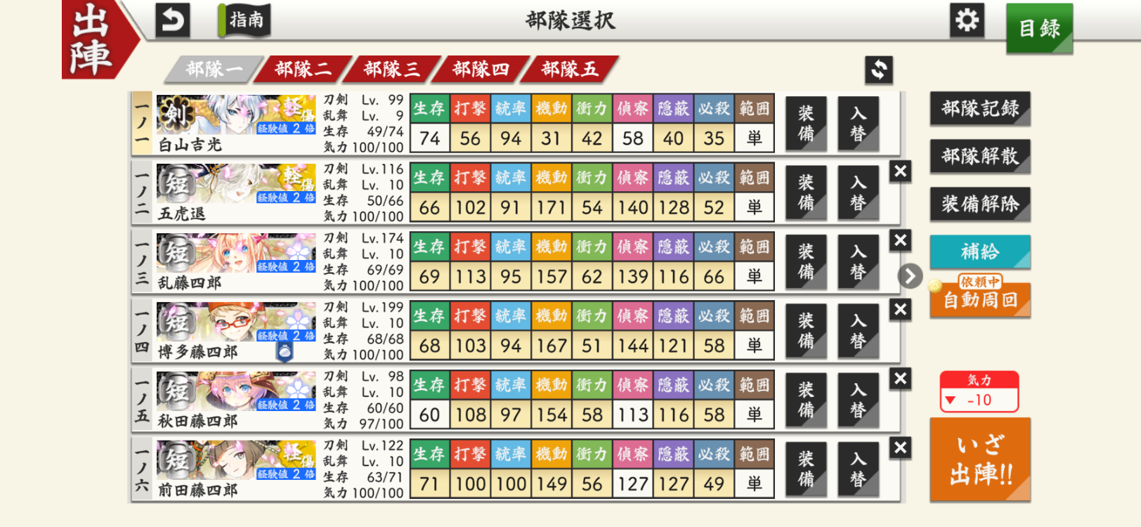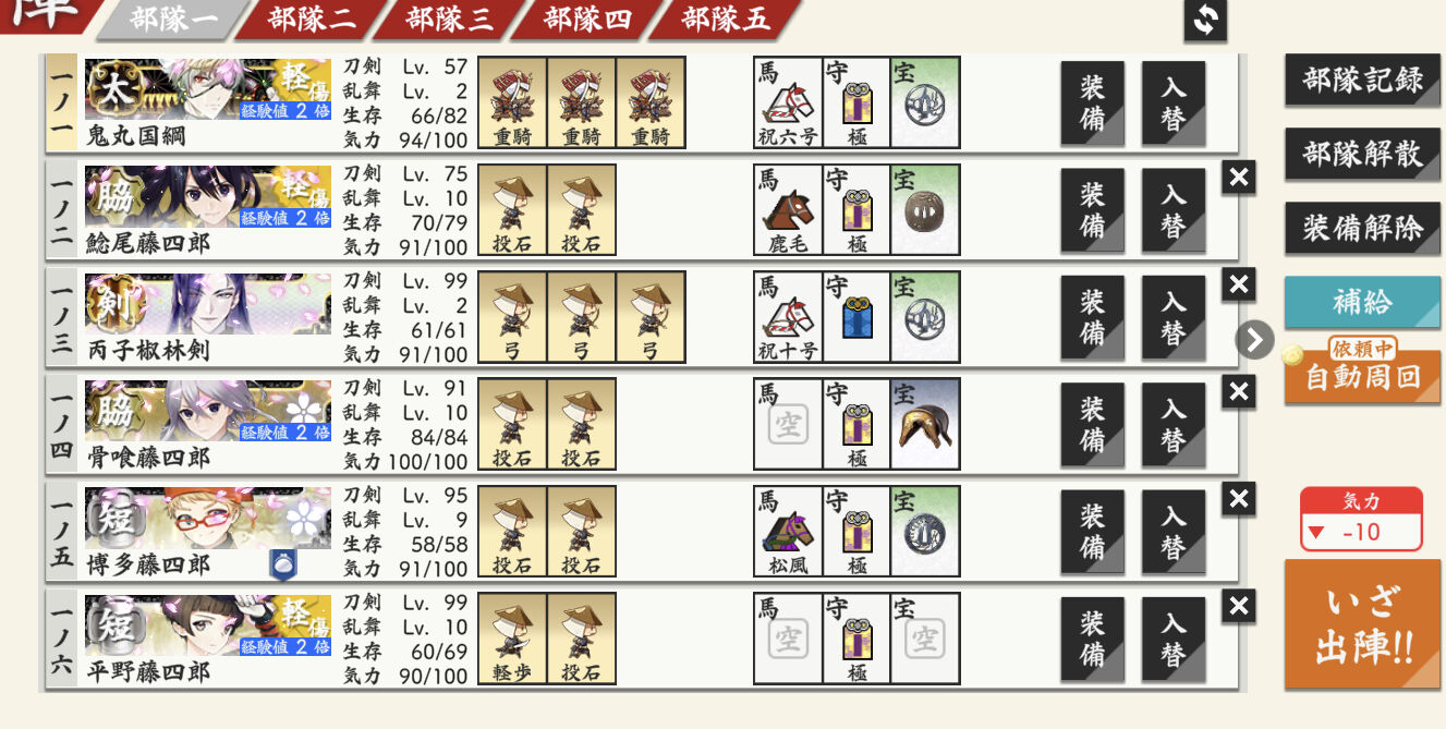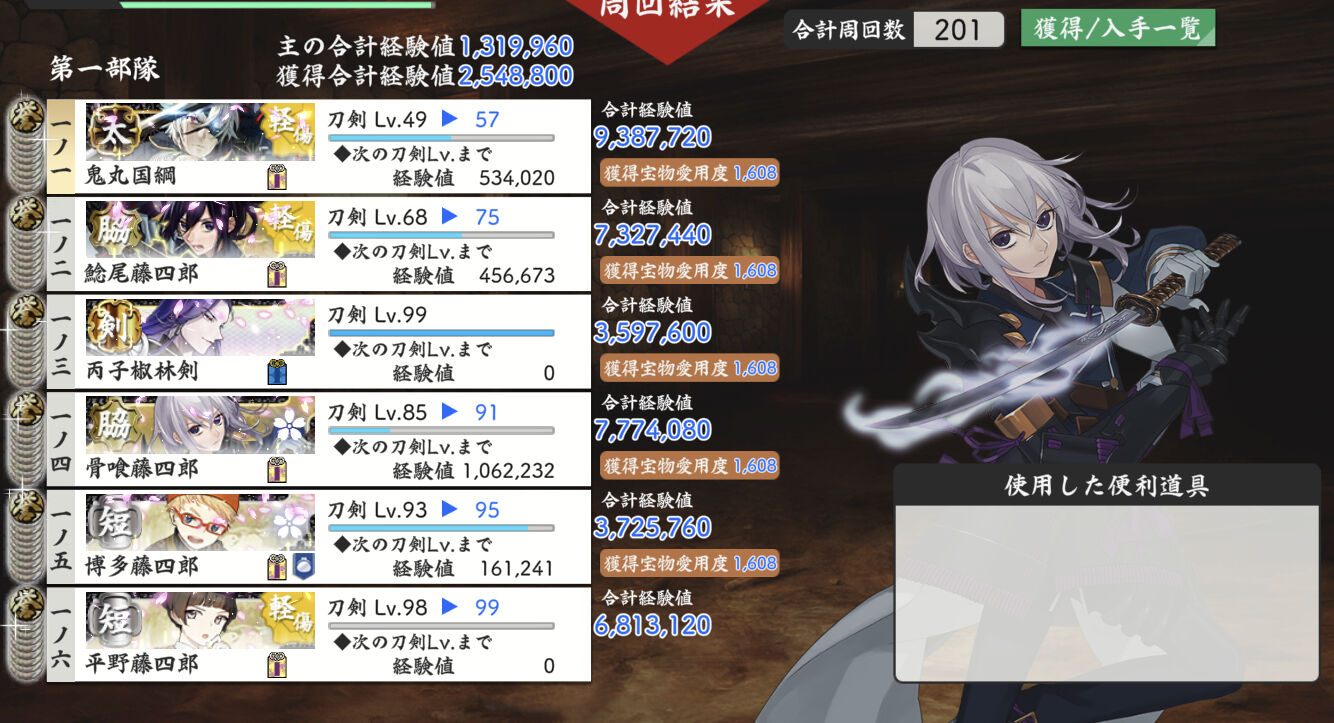 - 隊長鬼丸→Lvが40代後半からの開始したのと疲労しにくいように隊長、極太刀2振り入れると片方が疲れがちなので部隊に極太刀は1振りまで、途中で一期一振と交代してた(2025年10月時は一期一振と鬼丸が経験値2倍対象だったので40代から両者ともLv99まで一気に上げることができた)