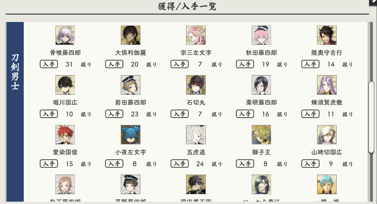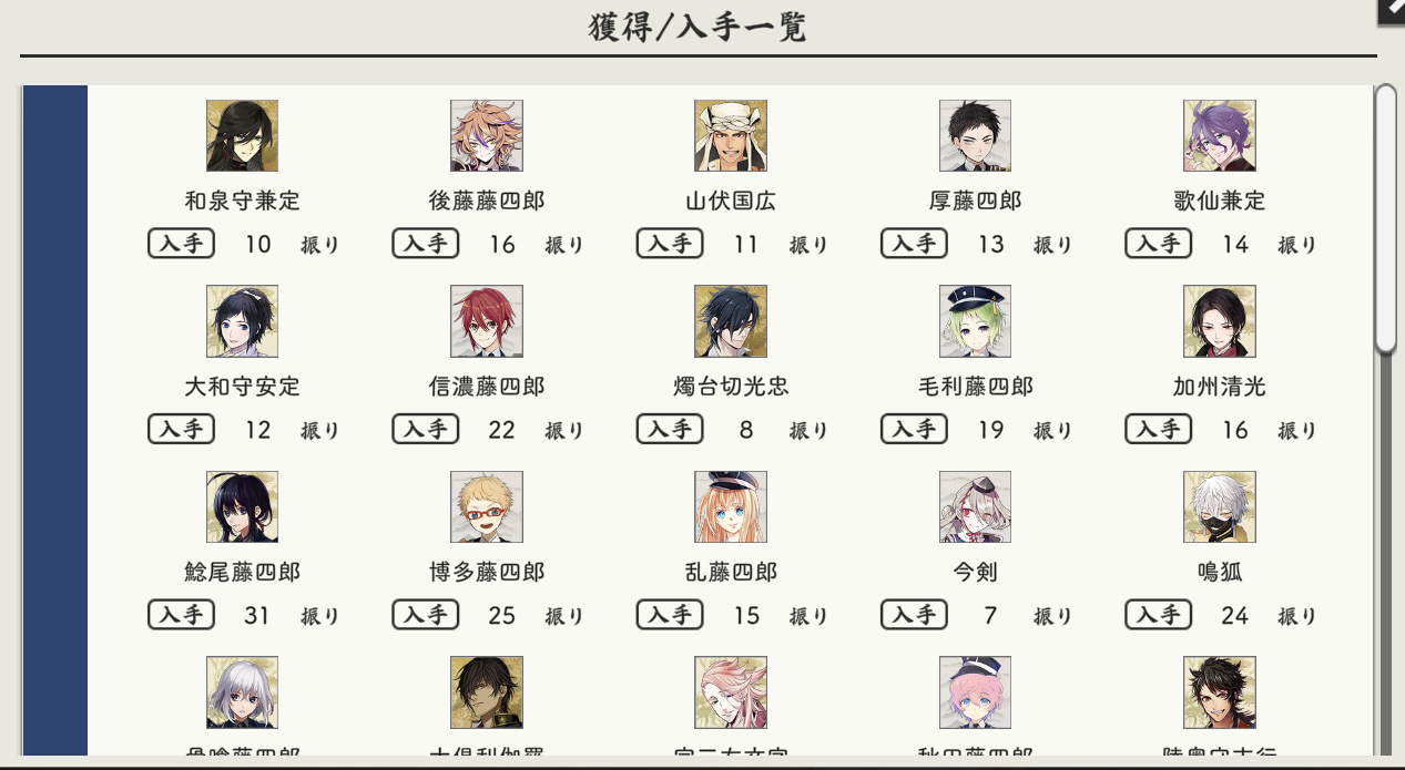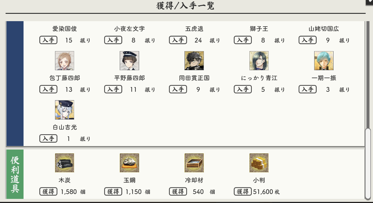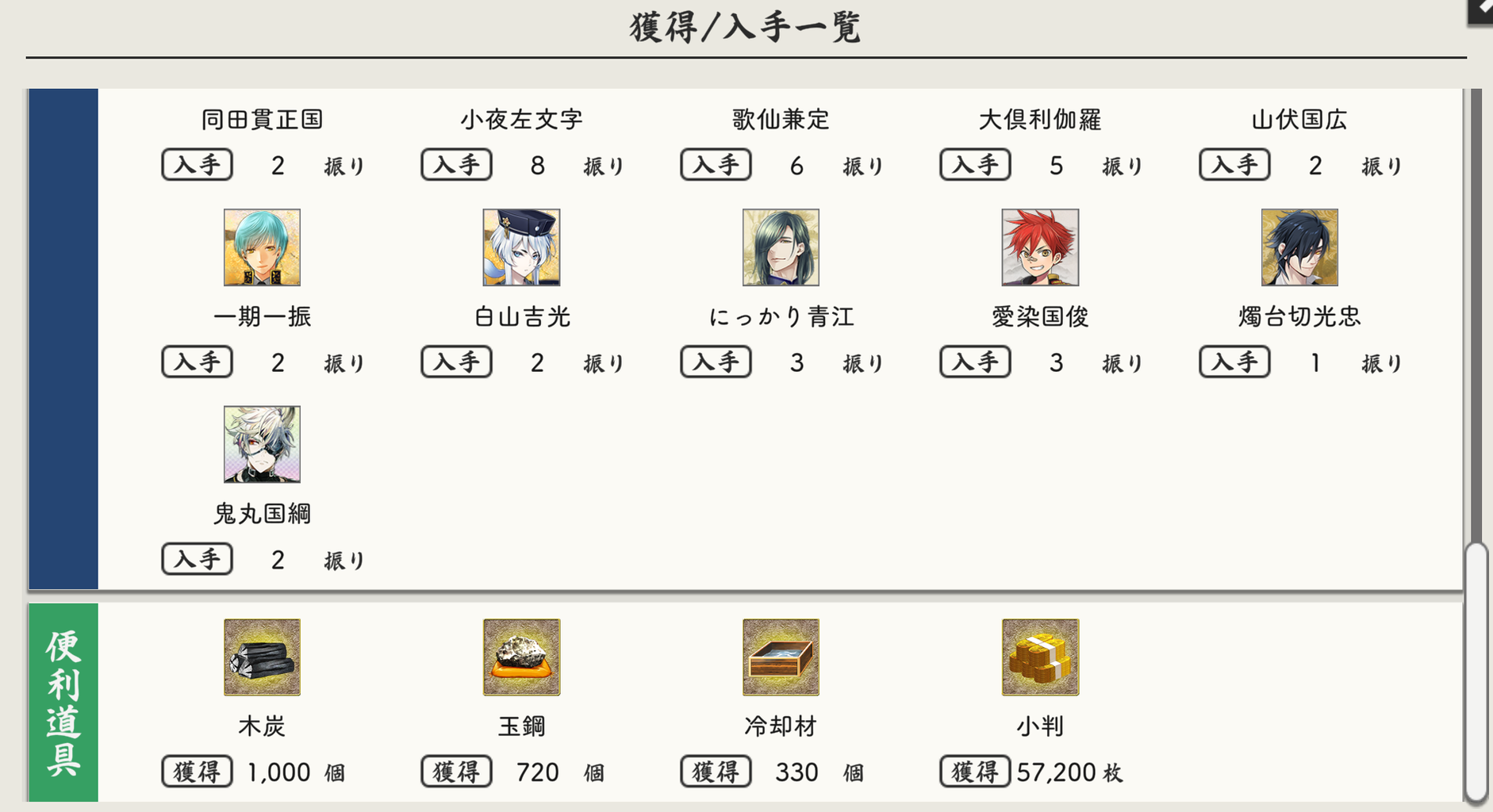 今回の結果は小判が140万枚、白山乱舞2→7、鬼丸3振りドロ、粟田口極短刀4振130→199、博多極48→119、一期極34→73でした。