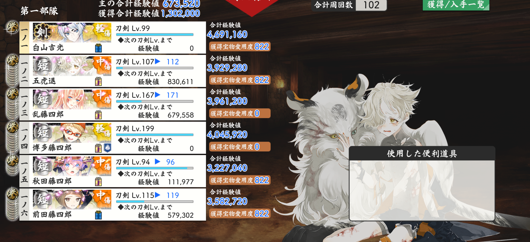 300周くらいで白山と鬼丸二振りずつ落ちたから個人的には大満足。夏の連隊戦に向けて極短刀のレベリングもできたし。