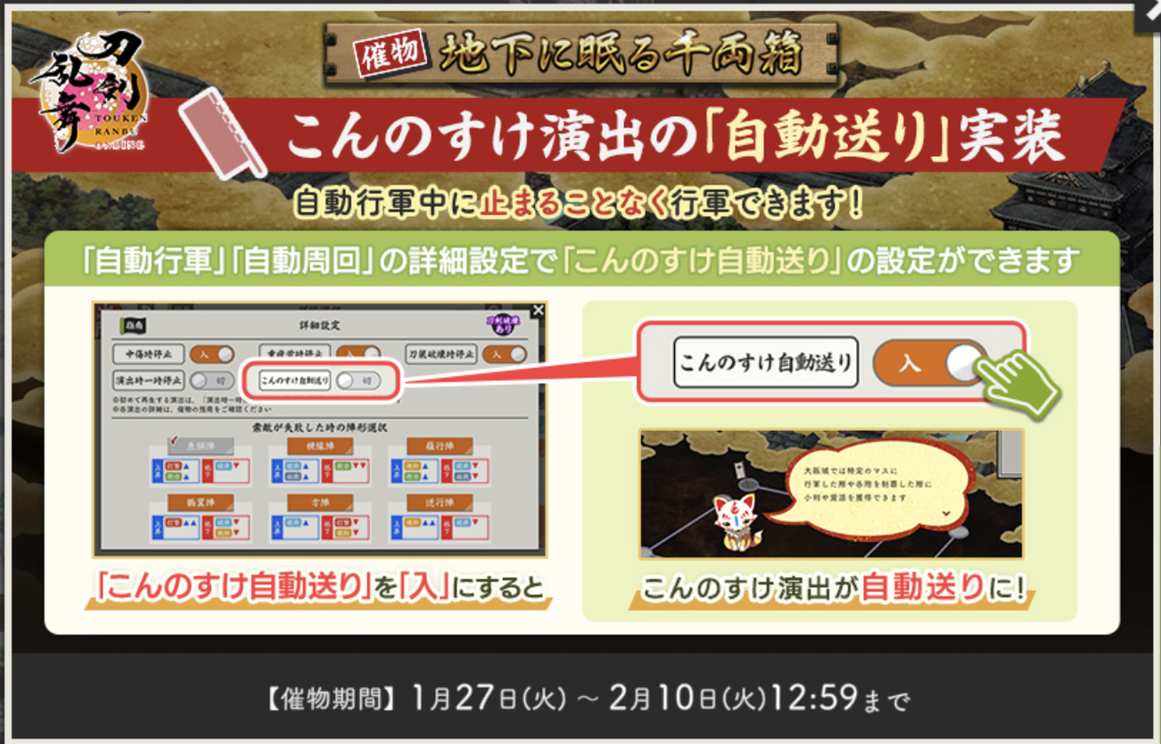 - 2026年1月以降、こんのすけさんの説明演出の自動送り機能が実装、これで自動周回時にこんのすけさんの説明演出で自動周回が止まらなくなる、ただし自動周回の設定画面でONにしないと有効にならないので注意