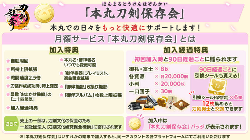 月額サブスクの「本丸刀剣保存会」に課金してると更に大阪城が楽になります丙子椒林剣がいたり高レベルの極が育ってるなど、放置で99Fを周回できる戦力ある人は一番課金した方が良い要素です