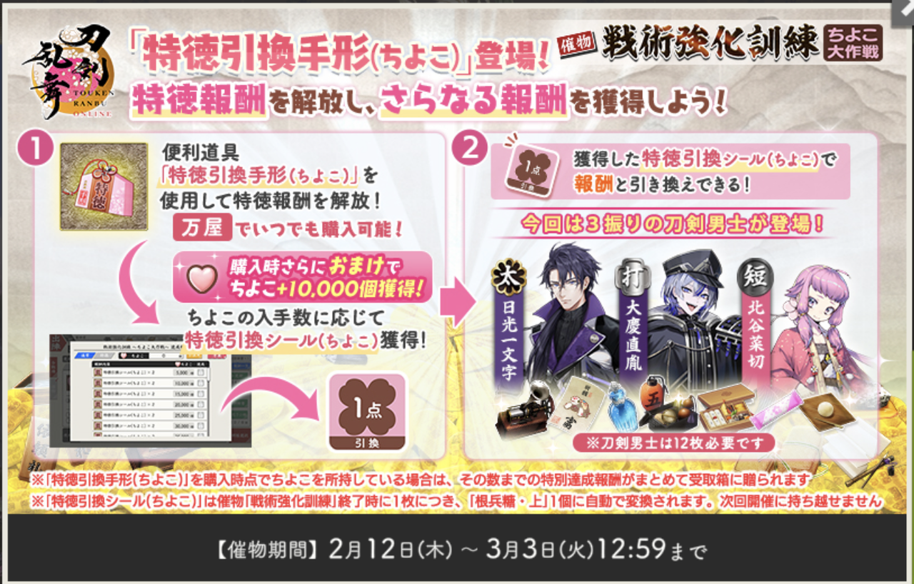 刀剣乱舞ONLINE(とうらぶ)の2026年2月イベント「戦術強化訓練〜ちよこ大作戦〜」の記事、第5回目の戦術強化訓練です。