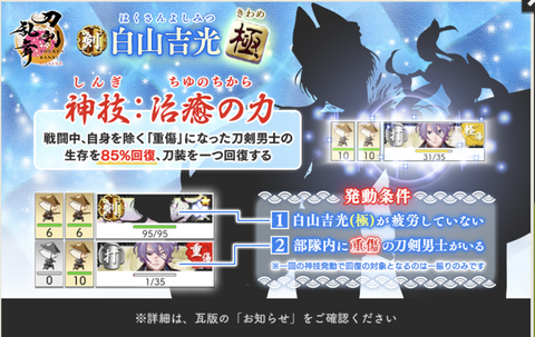 2022年06月21日 極打刀の特殊能力の「かばう」効果の対象が広がる!隣接してない刀剣にも発動する様に!極打複数編成で発動しやすくなる!中傷重傷でも発動! カテゴリ:まとめ・データ記事ニュース コメント : 204